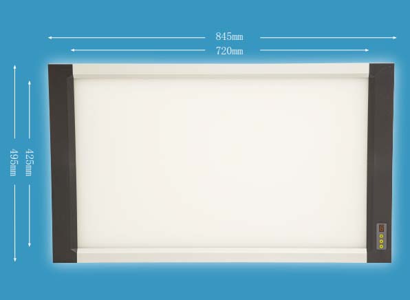3、外形尺寸:845*495*25mm; 观察屏尺寸:720*425mm;可同时观看2张14*17寸的胶片,无漏光现象。